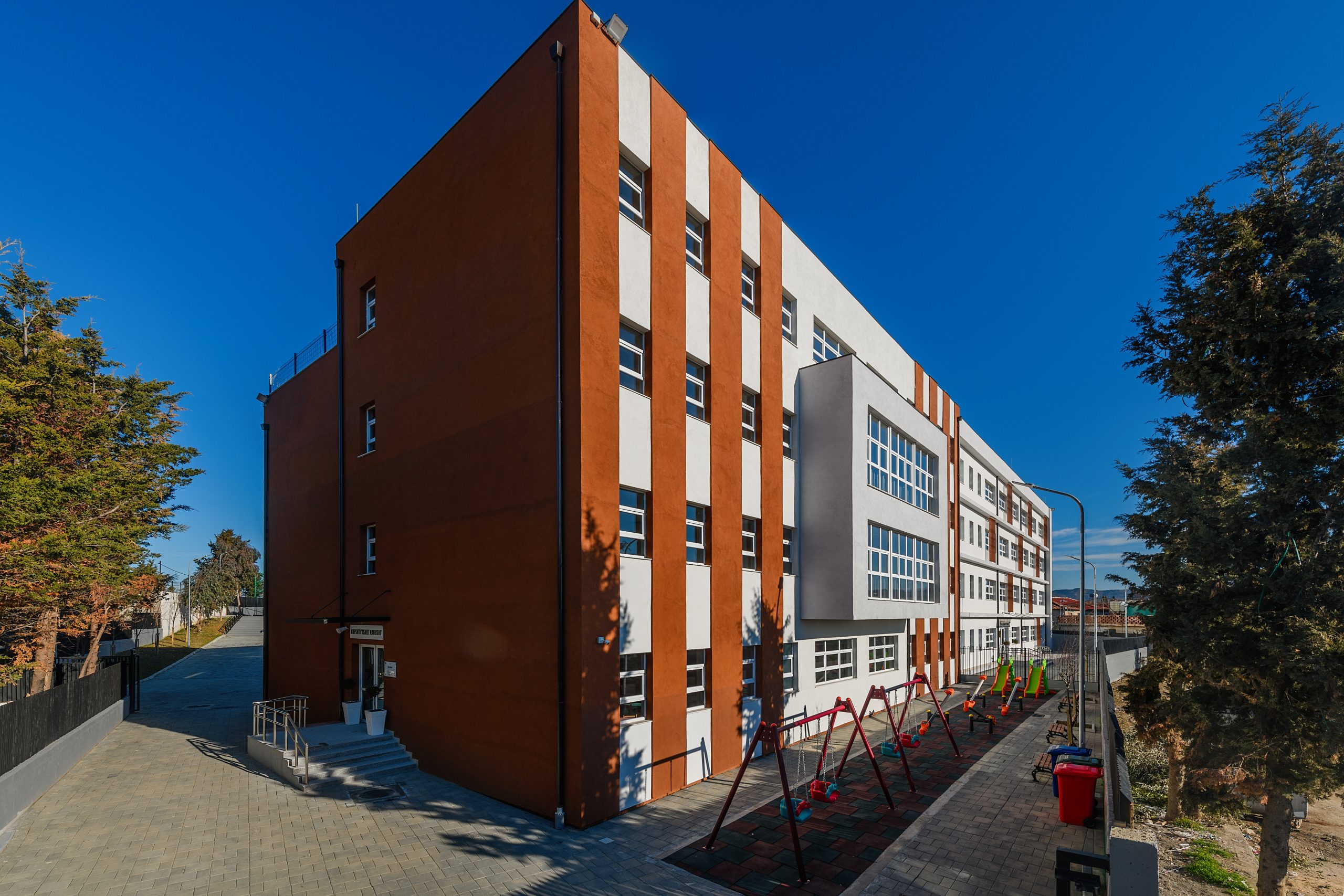 Secila nga shkollat ka hyrje të veçanta. Edhe pse ciklet janë të ndara, lejohet kontakti mes tyre, shkollës 9-vjeçare dhe gjimnazit në katin e 3-të (edhe për qasje të brendshme në palestër). Në pjesët ku drejtimi i akseve ndryshon në planimetri, është bërë një bashkim antisizmik, për shkak të shkallëzimit që paraqet objekti në plan dhe në lartësi. e rregullt në skajet. Kryqëzimi është në drejtimin vertikal dhe është konturuar në skajet me një kornizë në formën e një ekrani të spikatur 150 cm dhe të theksuar në gri të lehtë.