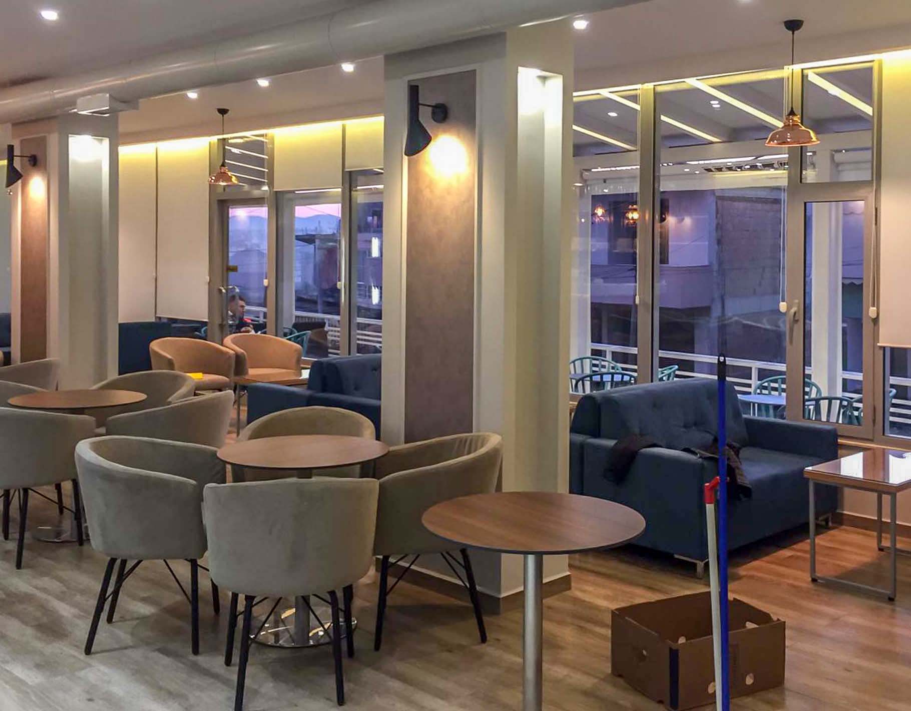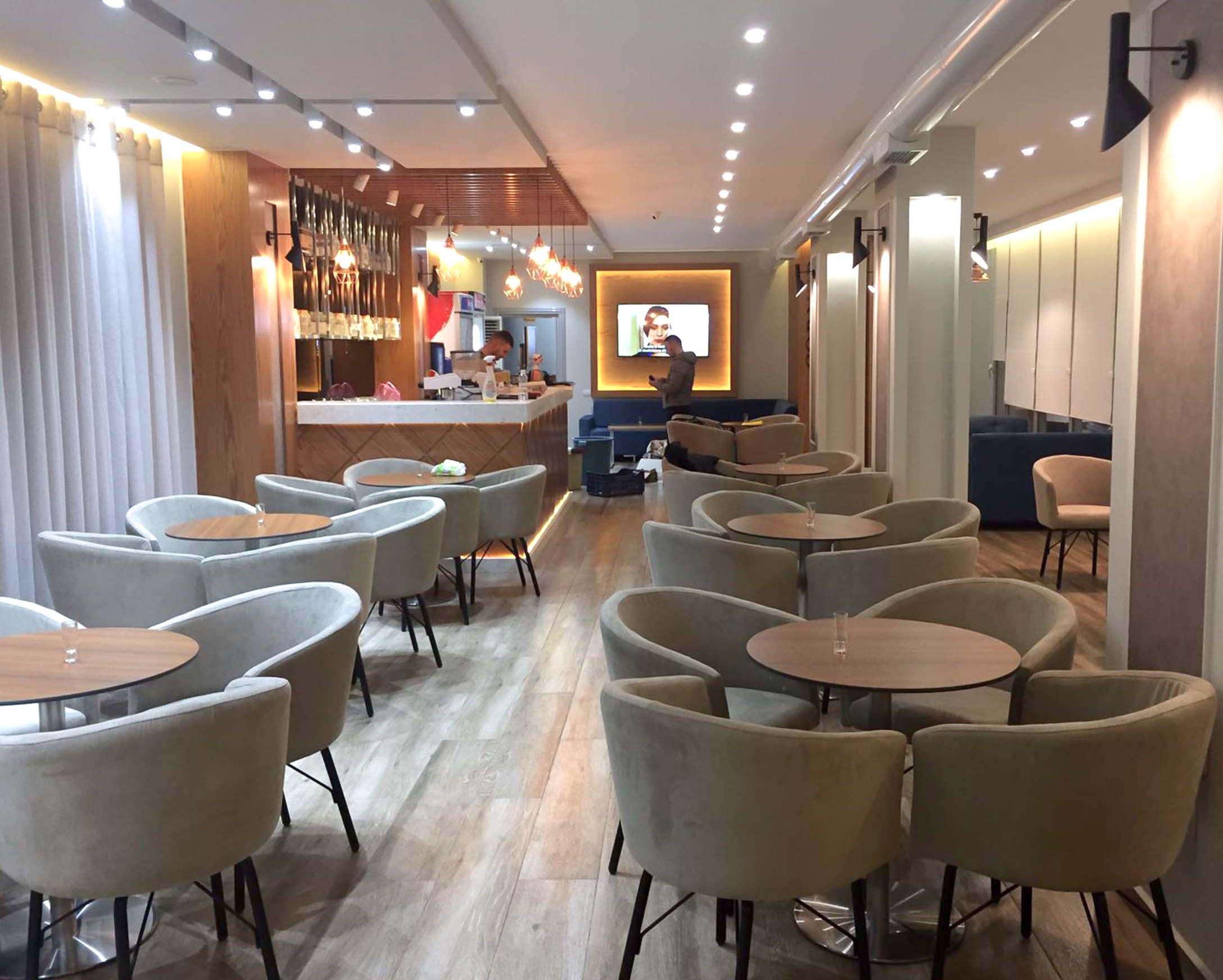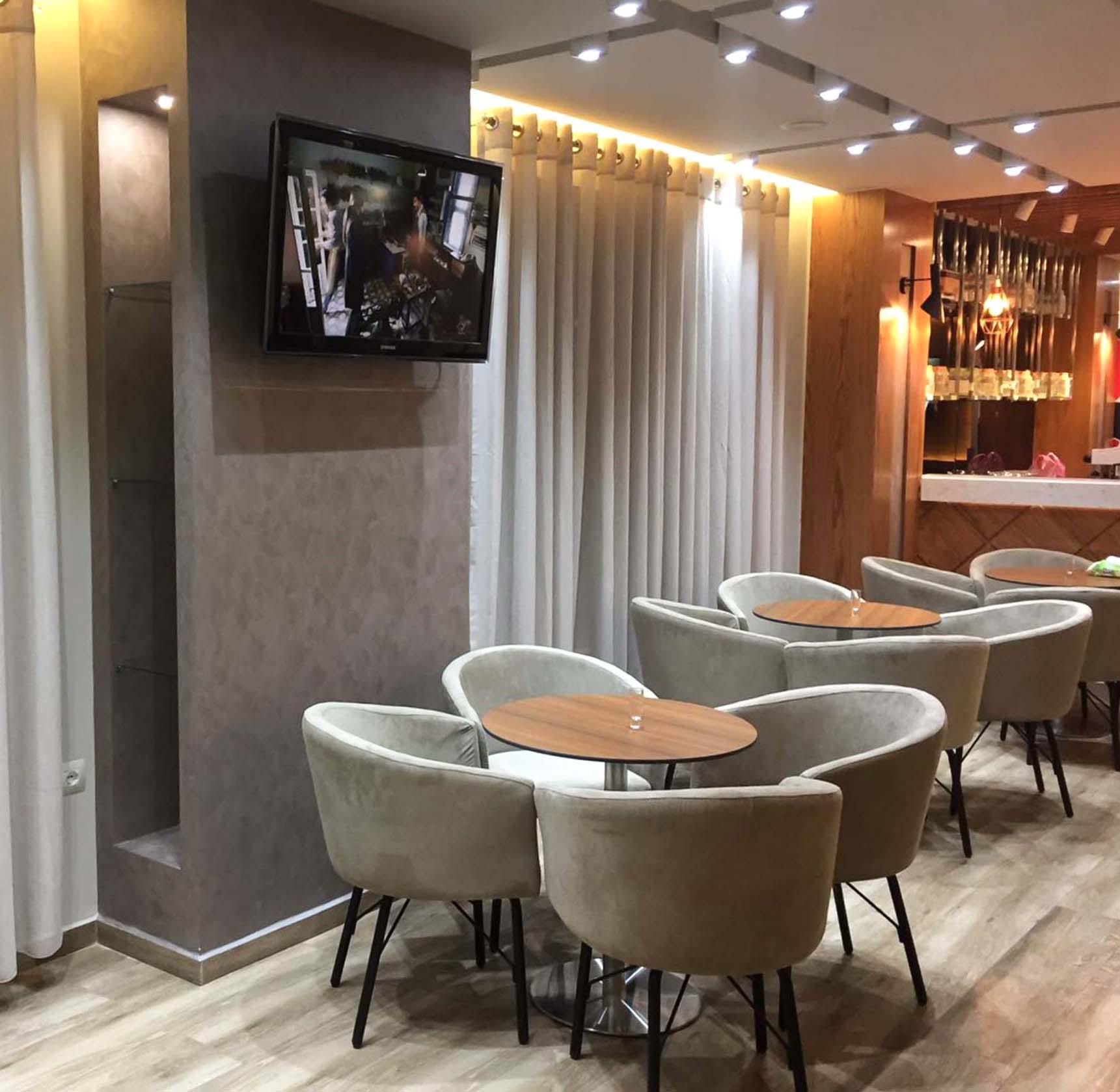 Ambjenti ka një sipërfaqe prej 170 m² dhe ndodhet në kryqëzimin mes rrugës “Demokracia” dhe rrugës “Andon Zako Cajupi” në Tiranë. Lokali organizohet në 2 ambjente; Ambjenti i verandës jashtë, i cili lidhet me ambientet e brëndshme me anë të një vetrate xhami. Në ambientet brenda lokalit, banaku zë pamjen më të bukur të barit i cili është trajtuar me finesën e stilit modern duke vënë në dukje qendrën e ambjentit. Kolonat janë trajtuar në mënyrë që të mos duken si të tilla por kanë marë pamje dekoruese në ambjent. Duke u përshtatur edhe me kërkesat e klientit është kombinuar cdo gjë me detaj, nisur nga tavani, ndriçimi, teksturat, etj. Format e përdorura janë ato të tipit gjeometrike të pastra duke lënë të kuptohet hapësira e lirë në këtë ambient.