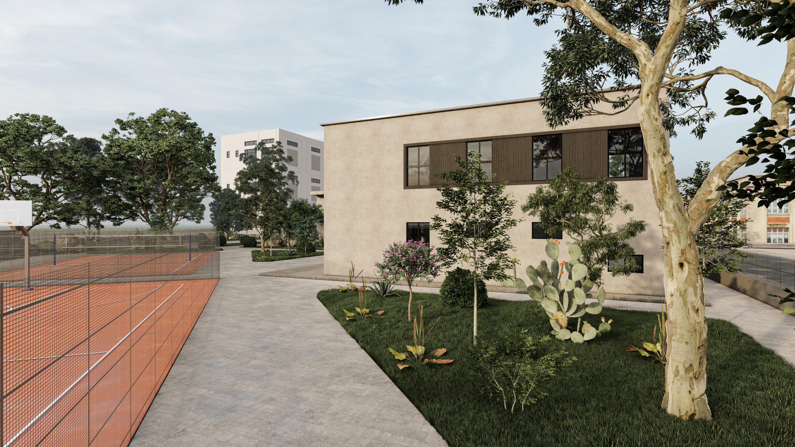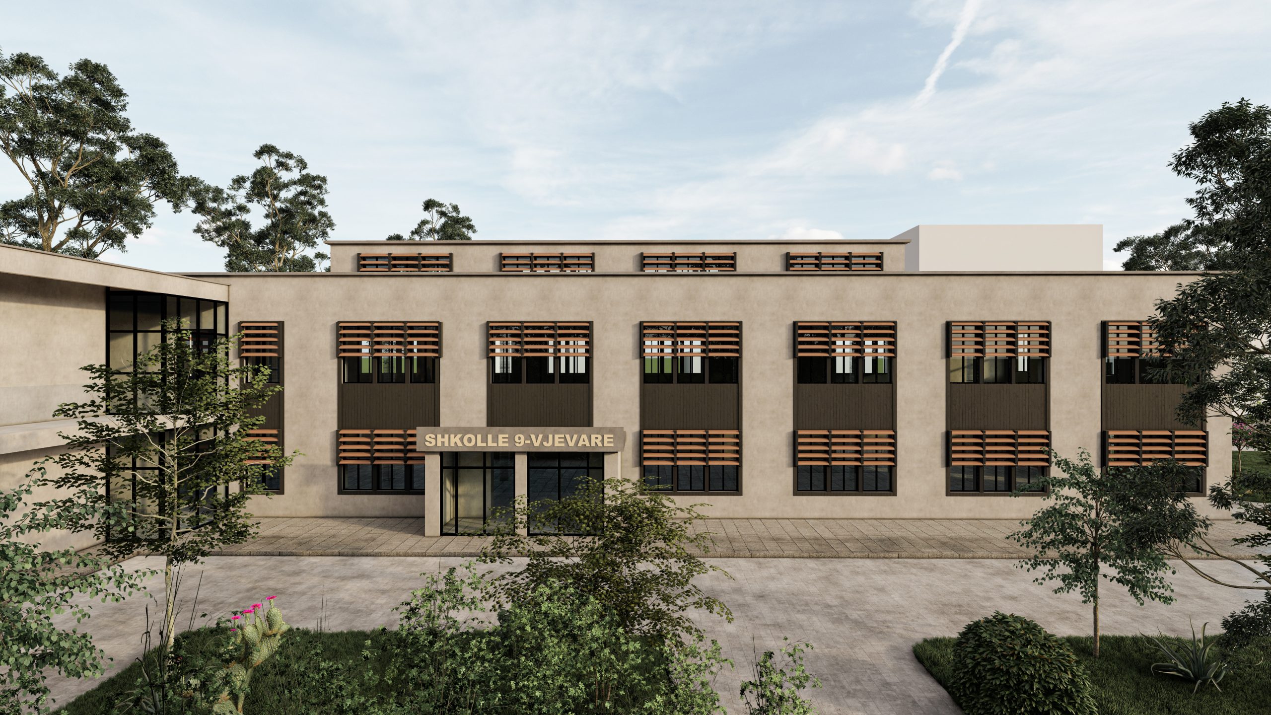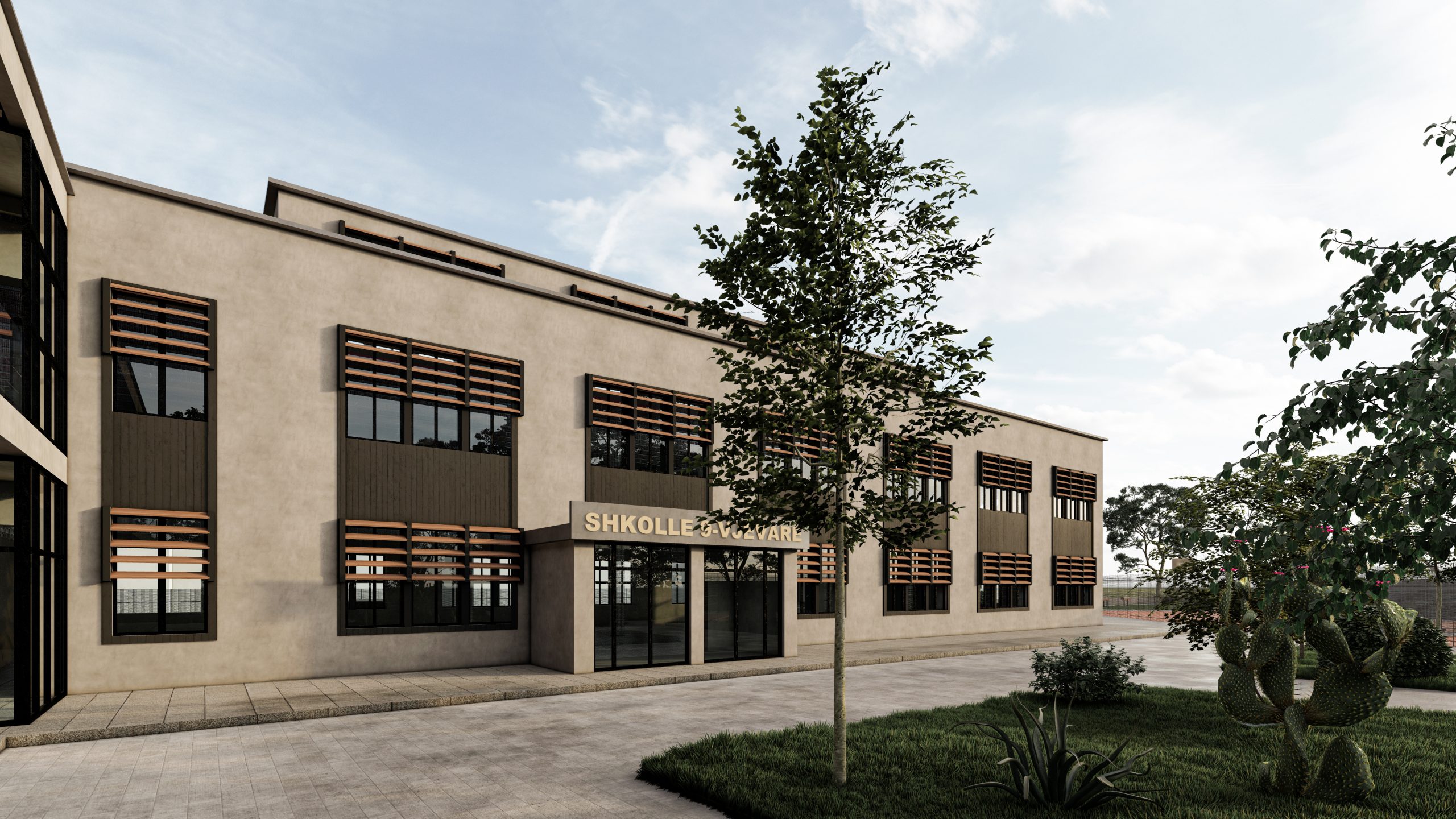 Ne fasade eshte perdorur suva grafiato gri e zbehte dhe gri e erret per te thyer monotonine ne fasade
