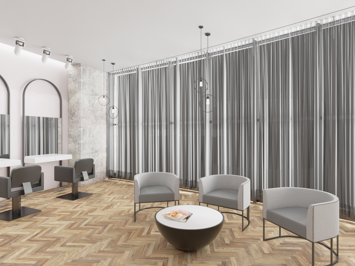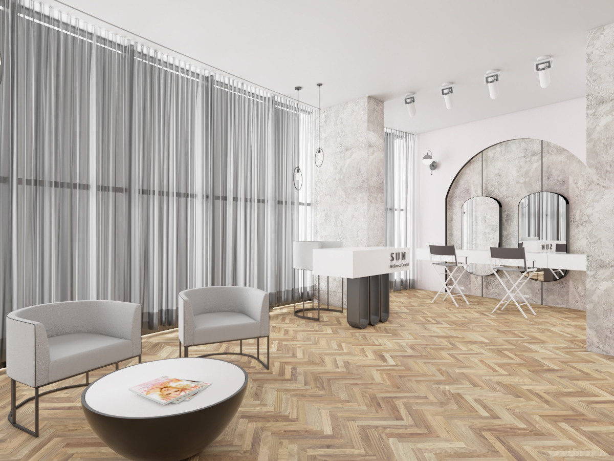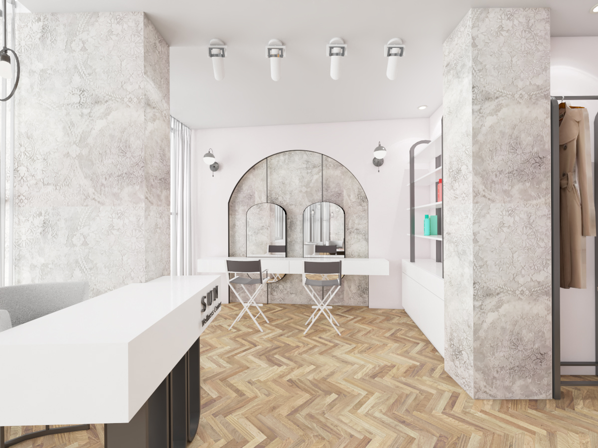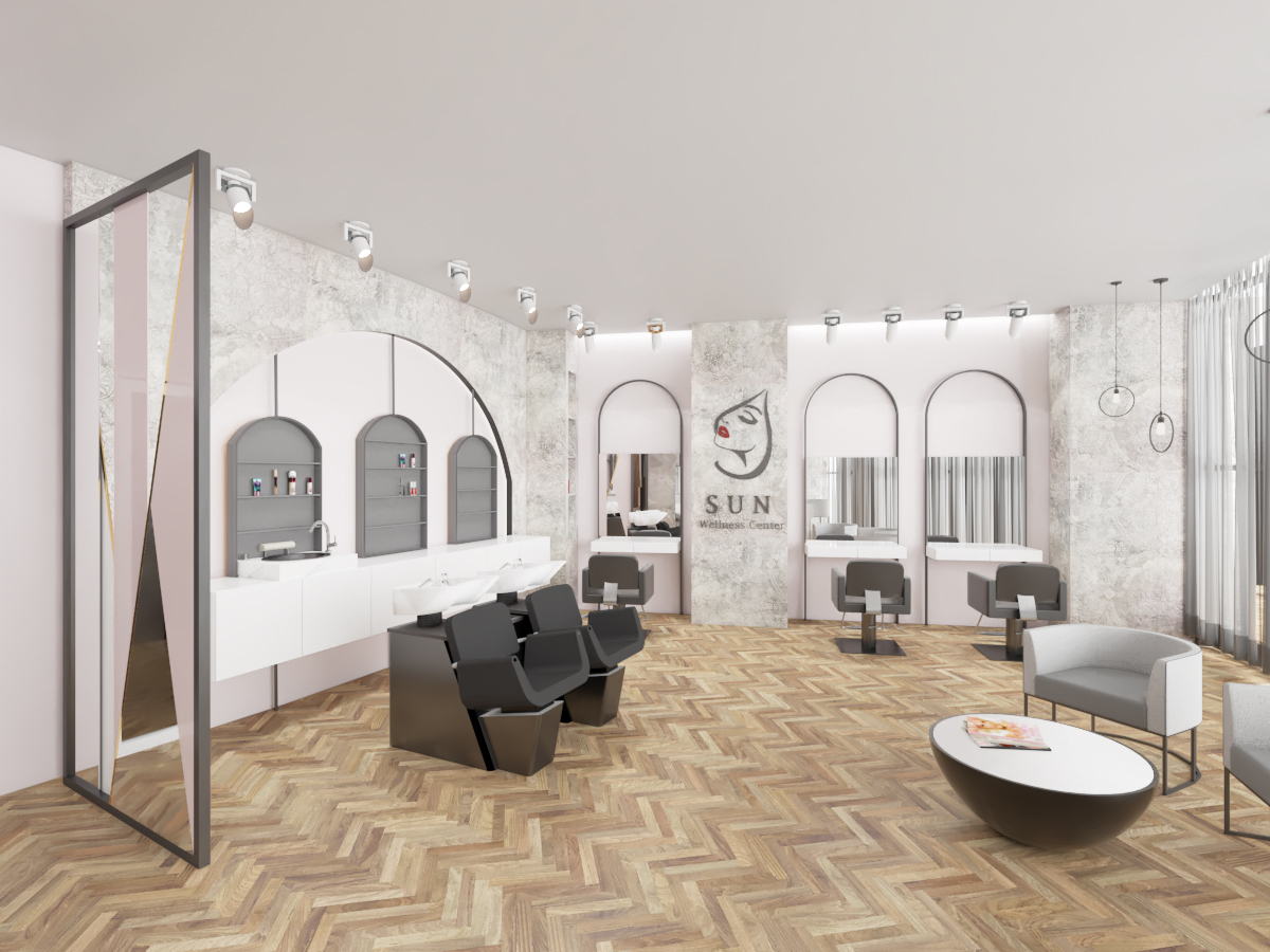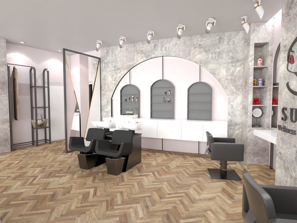 Ky sallon ka një sipërfaqe prej 90 m2 dhe ndodhet Tiranë, në një zonë me zhvillim të ri urban. Salloni është organizuar në menyre te tille qe te plotesoje te gjitha funksionet e nevojshme ne ate ambjent. Salloni është mjaft funksional, me hapsira racionale dhe njëkohësisht të bollshme. Salloni ka një stil modern karakterizohet nga ngjyra të ftohta dhe pastel. Format e perdoruara në mobilim janë të thjeshta dhe të nje stili minimal, duke shfrytëzuar në maksimum hapsirën.