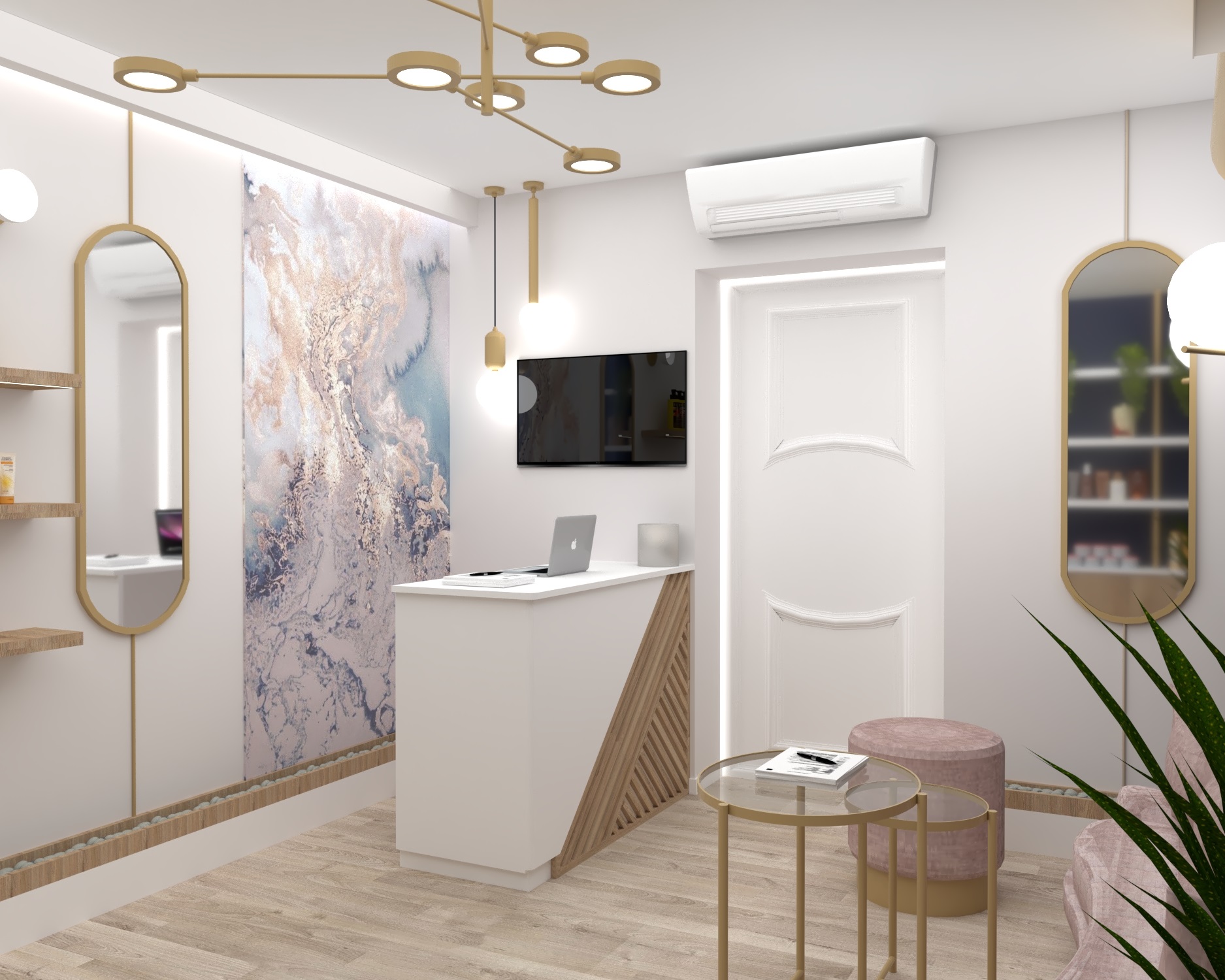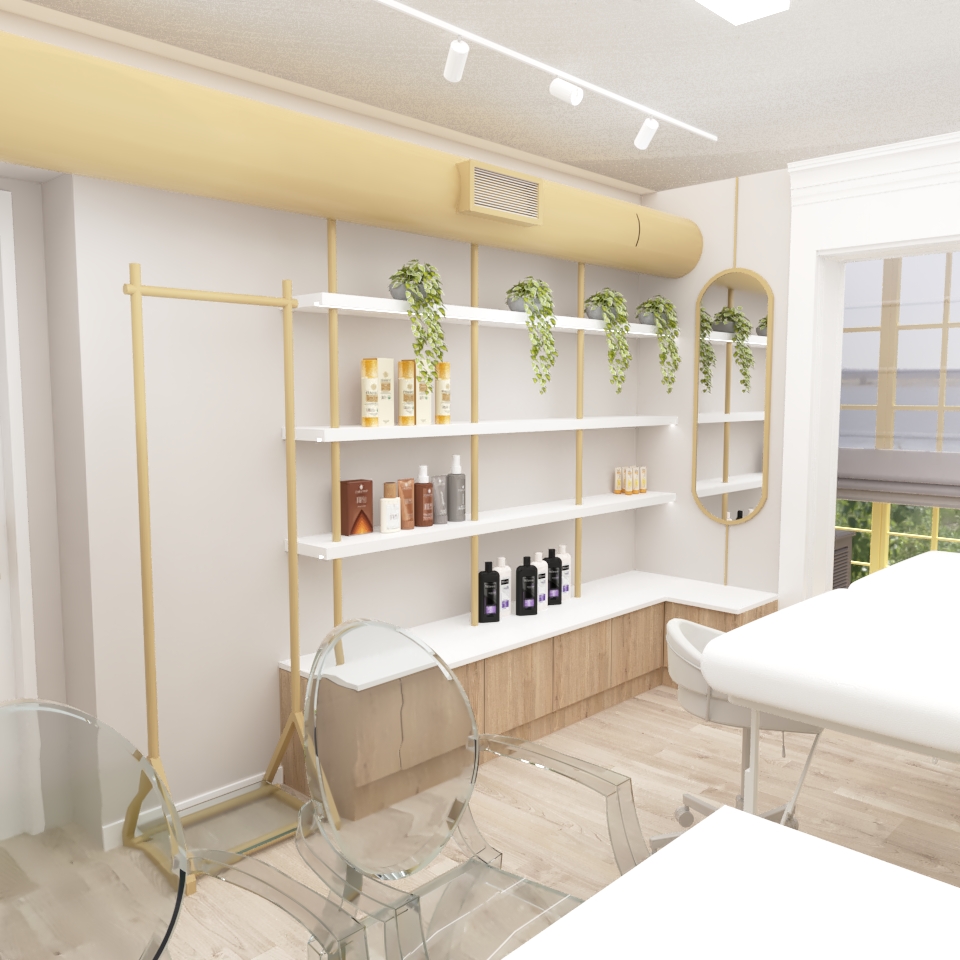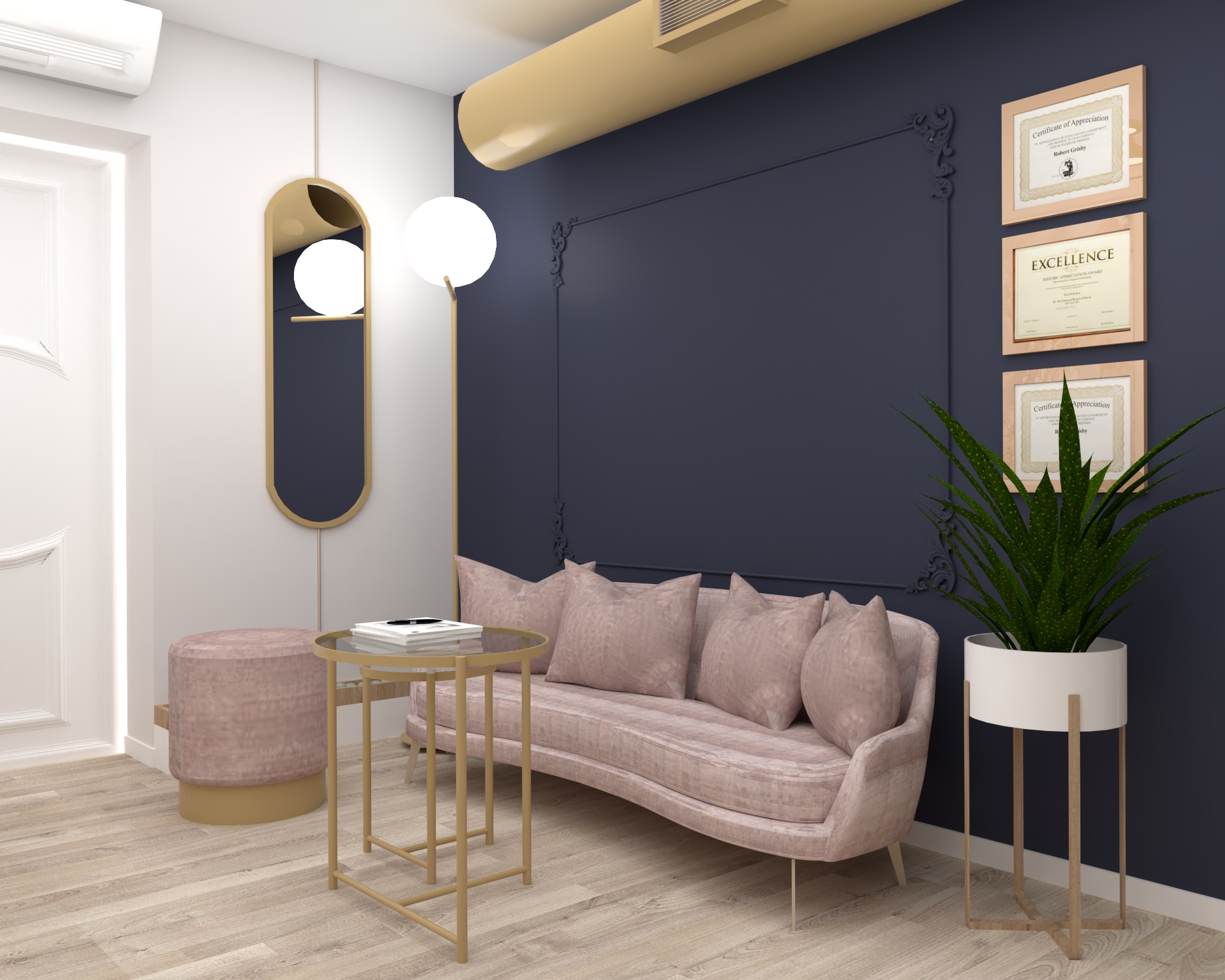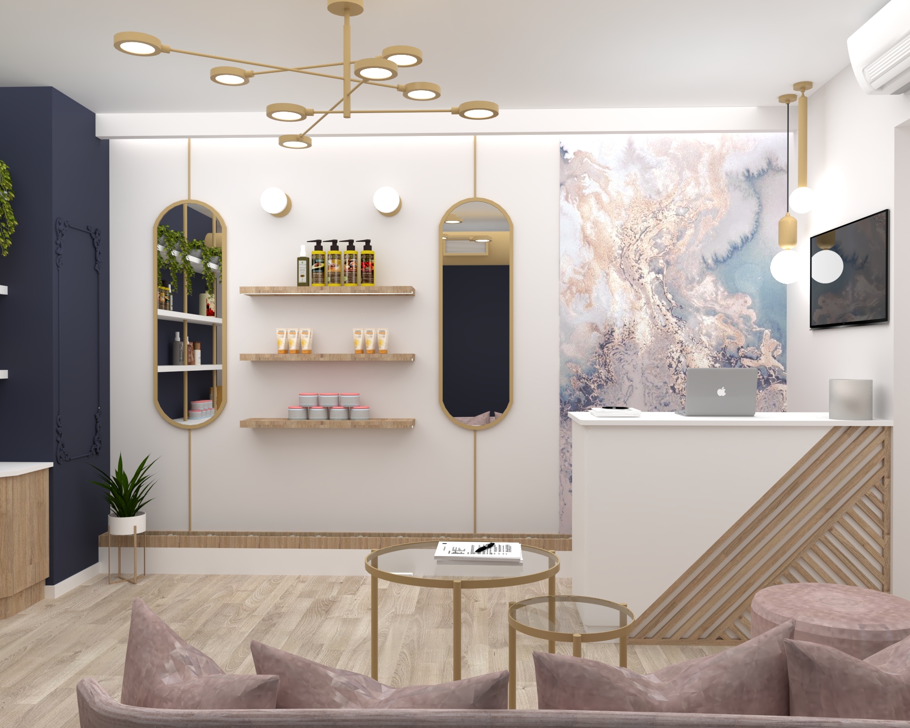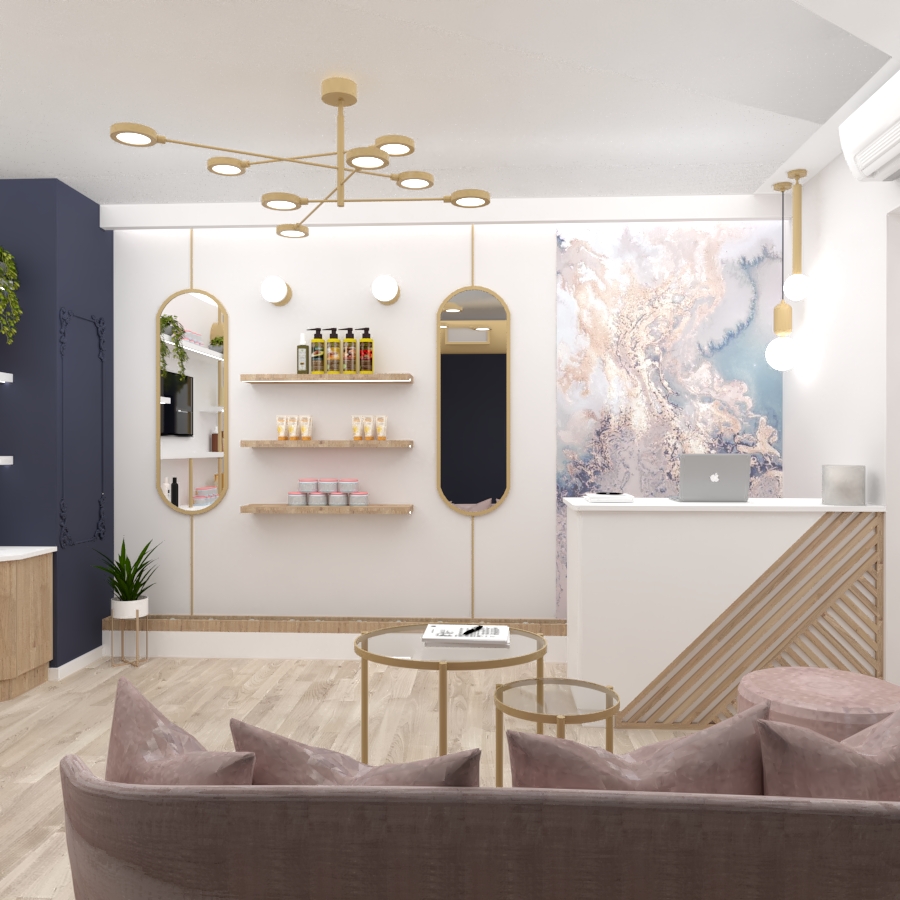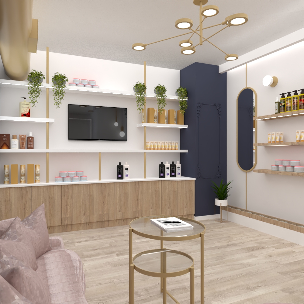 Ky sallon ka një sipërfaqe prej 75 m2 dhe ndodhet Tiranë, në një zonë me zhvillim të ri urban. Salloni është organizuar në menyre te tille qe te plotesoje te gjitha funksionet e nevojshme ne ate ambjent. Salloni është mjaft funksional, me hapsira racionale dhe njëkohësisht të bollshme. Salloni ka një stil modern karakterizohet nga ngjyra të ngrohta roze pastel dhe te ftohte navy blue per te krijuar nje contrast te forte. Format e perdoruara në mobilim janë të thjeshta dhe të nje stili modern, duke shfrytëzuar në maksimum hapsirën.