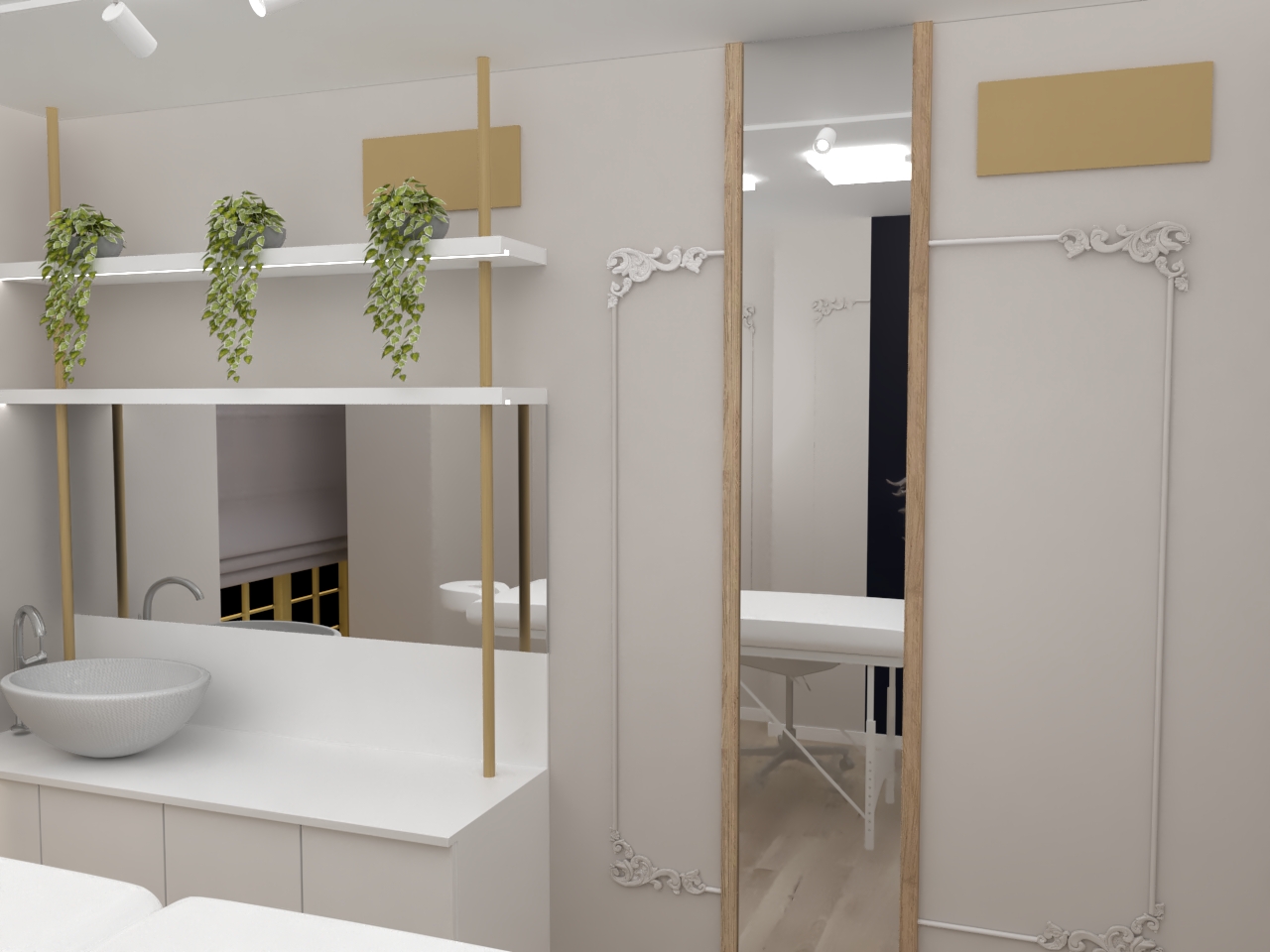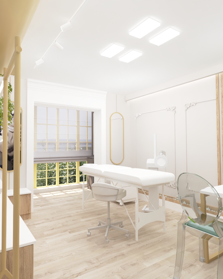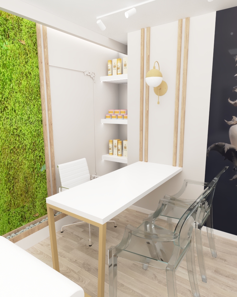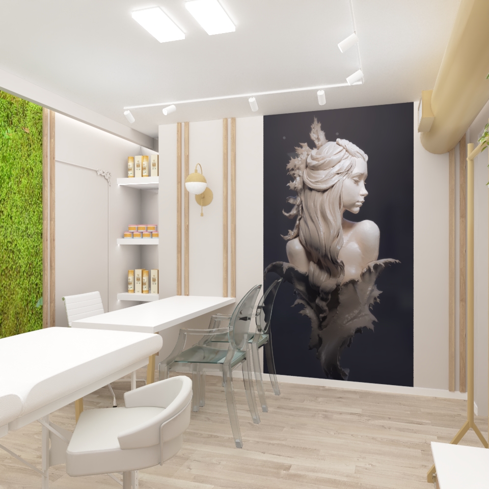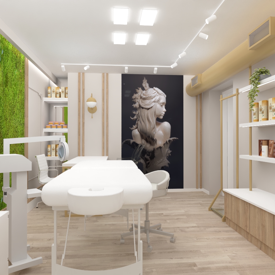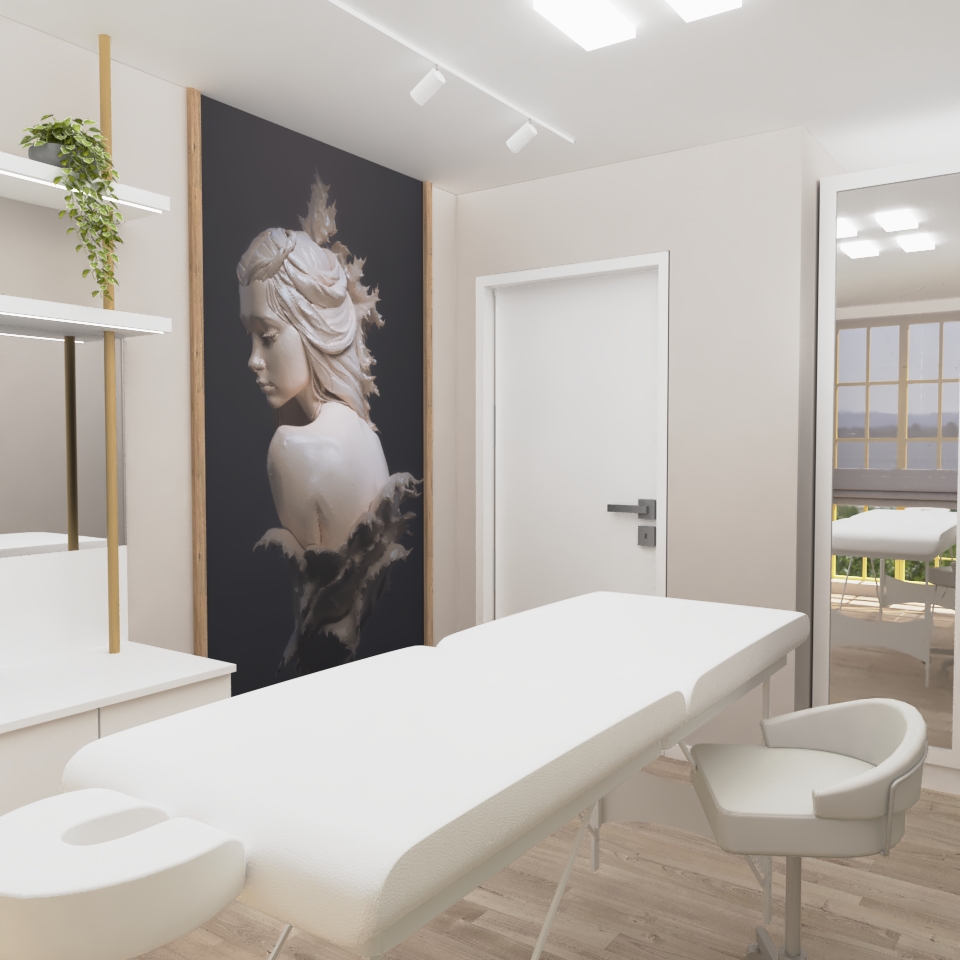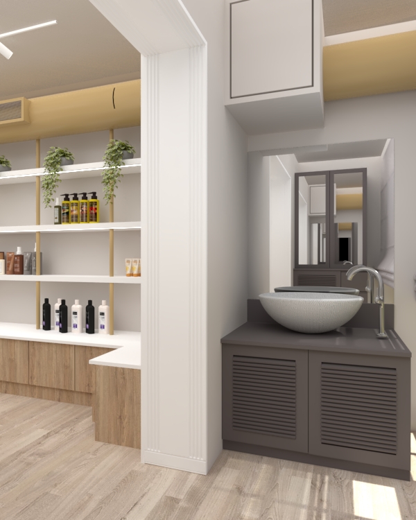 Ky sallon ka një sipërfaqe prej 75 m2 dhe ndodhet Tiranë, në një zonë me zhvillim të ri urban. Salloni është organizuar në menyre te tille qe te plotesoje te gjitha funksionet e nevojshme ne ate ambjent. Salloni është mjaft funksional, me hapsira racionale dhe njëkohësisht të bollshme. Salloni ka një stil modern karakterizohet nga ngjyra të ngrohta roze pastel dhe te ftohte navy blue per te krijuar nje contrast te forte. Format e perdoruara në mobilim janë të thjeshta dhe të nje stili modern, duke shfrytëzuar në maksimum hapsirën.
